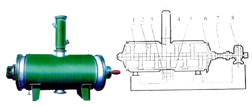 | 1、殼體 2、耙齒 3、出料裝置 4、加料裝置 5、粉碎棒 6、密封裝置 7、攪拌軸 8、傳動裝置 |